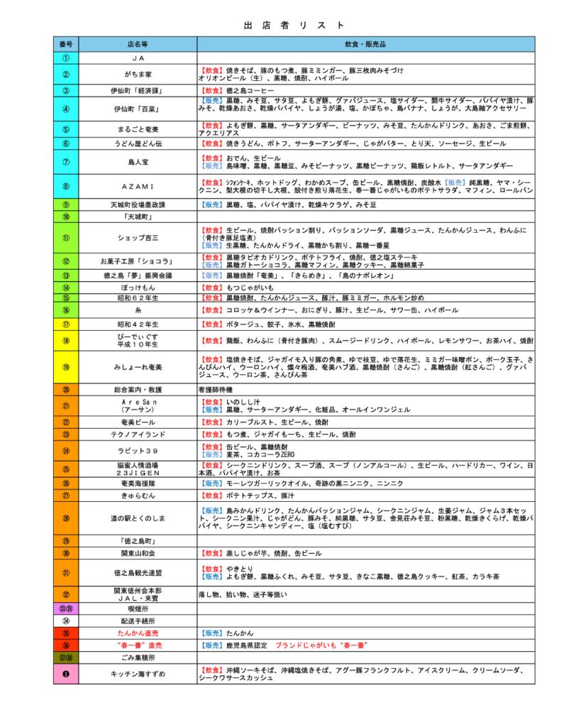 【飲食】塩焼きそば、ジャガイモ入り豚の角煮、ゆで枝豆、ゆで落花生、ミミガー味噌ポン、ポーク玉子、さんぴんハイ、ウーロンハイ、燦々梅酒、奄美ハブ酒、黒糖焼酎(さんご)、黒糖焼酎(紅さんご)、グァバジュース、ウーロン茶、さんぴん茶